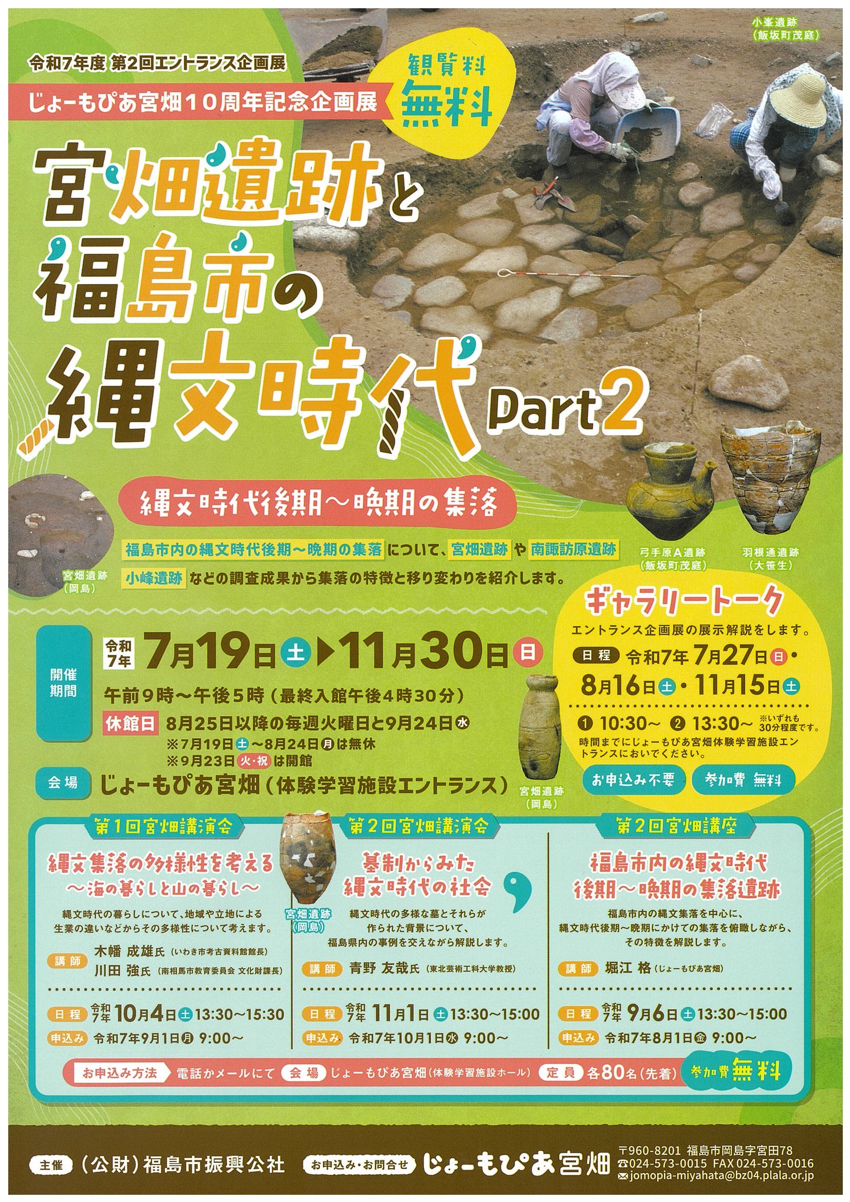 定員先着80名(要申込)。縄文時代の多様な墓とそれらが作られた背景について、県内の事例を交え解説する。10月1日(水)午前9時から、電話またはEメール jomopia-miyahata@bz04.plala.or.jp にて申込受付。