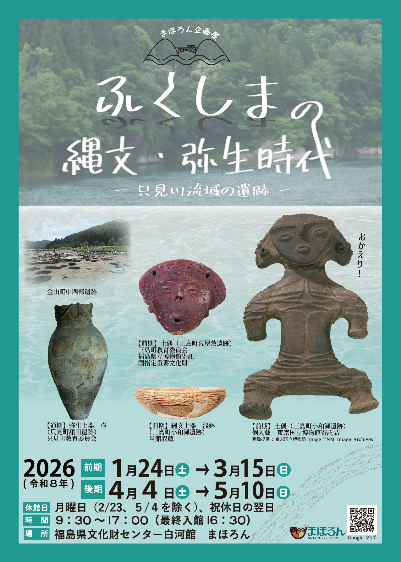 奥会津地方を流れる只見川流域に所在する遺跡にスポットを当て紹介する企画展。近年発掘調査が行われた三島町・小和瀬遺跡や、金山町・中西部遺跡から出土し同館に所蔵されている縄文時代晩期後葉から弥生時代中期中葉の土器や土偶のほか、只見・金山・三島・柳津・会津坂下の各町所蔵の関連資料などを展示し、只見川流域の縄文・弥生時代について考える。3月15日(日)までは前期展、展示品の入れ替え期間をはさみ4月4日(土)から後期展。