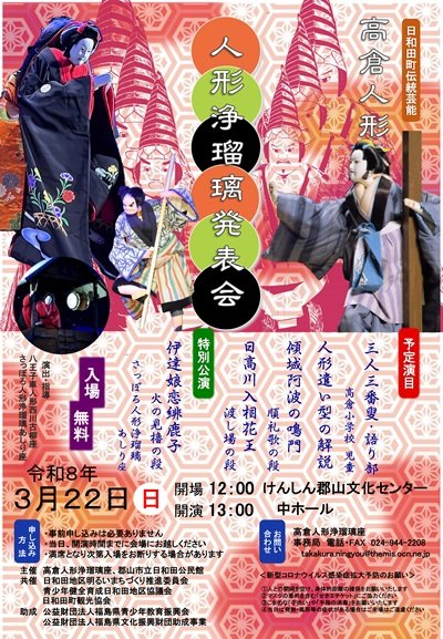 郡山市日和田町の高倉地区に伝わる「高倉人形」(県重要有形民俗文化財)の人形浄瑠璃の復活と継承を目指す「高倉人形浄瑠璃座」の定期公演。一座は2017(平成29)年から、地区の小学生から大人まで幅広い年齢層が参加して稽古を重ね、昨年、約130年ぶりに人形浄瑠璃の復活宣言をした。公演では、高倉小学校5・6年生による「寿式三番叟」のほか、「傾城阿波の鳴門 順礼歌の段」「日高川入相花王 渡し場の段」の披露や操演技術を解説する。特別ゲストとして、一座を指導する「さっぽろ人形浄瑠璃あしり座」が「伊達娘恋緋鹿子 火の見櫓の段」を上演し、公演に華を添える。
