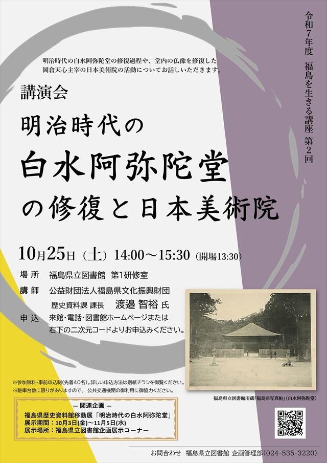 また、10月25日(土)午後2時からは、福島県立図書館の第1研修室で福島県文化振興財団歴史資料課長の渡邉智裕による関連講座「明治時代の白水阿弥陀堂の修復と日本美術院」(福島を生きる講座第2回)も開催します。
