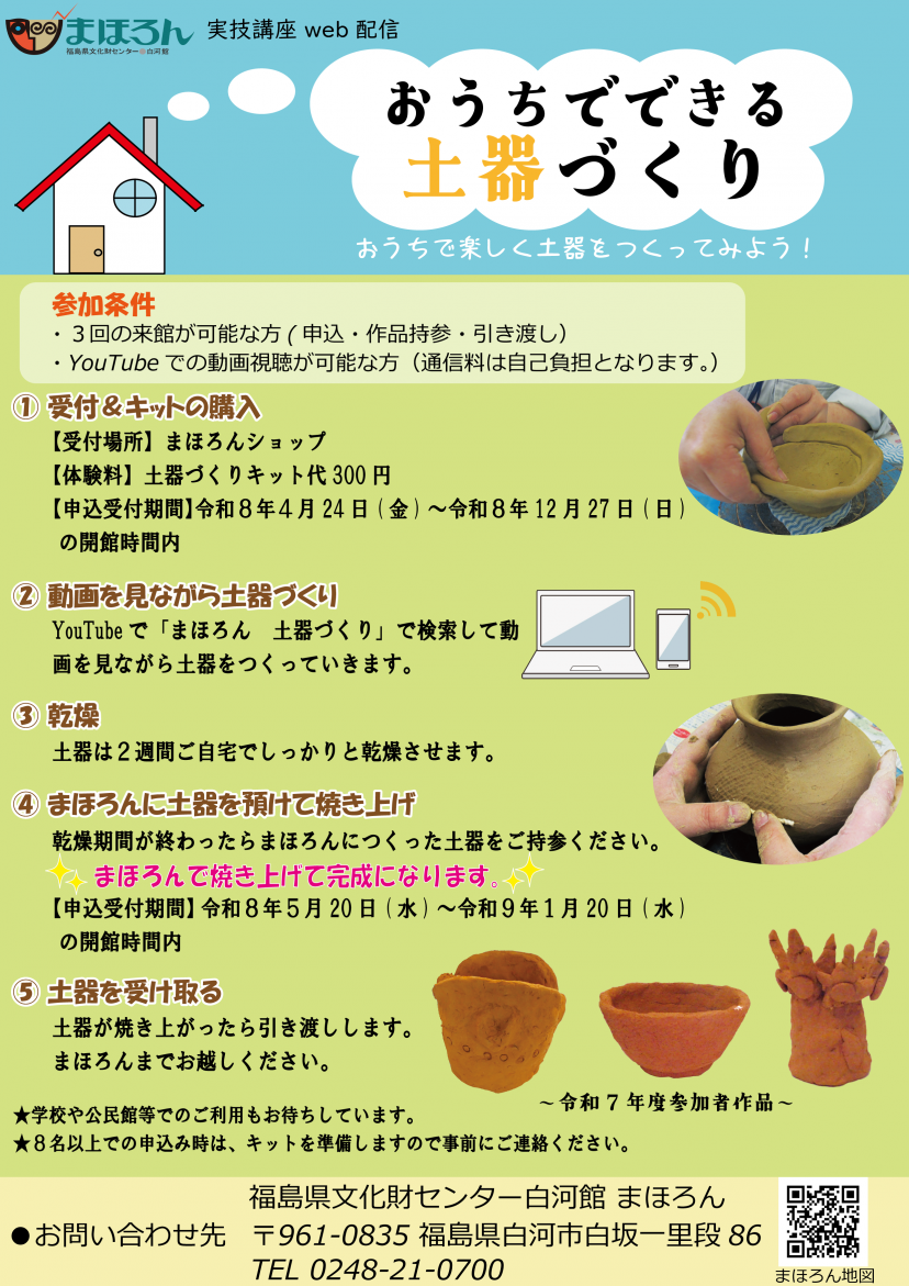 まほろんのYouTubeチャンネルにある土器づくりの動画を見ながらご自宅で土器をつくる講座です。(動画はこちら)