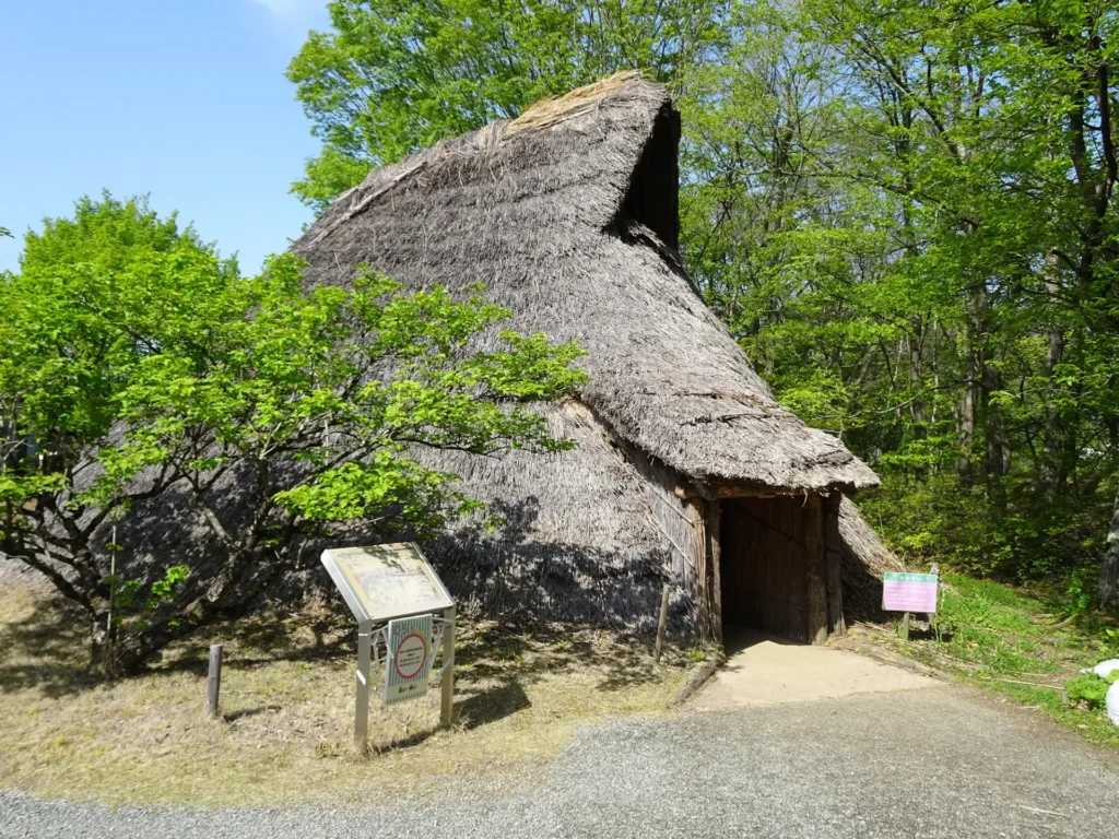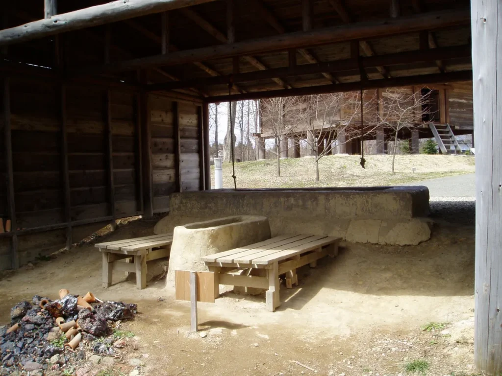 白河市谷地前C遺跡で見つかった竪穴住居跡をもとに復元した建物です。建物内には、カマドや貯蔵穴が再現されています。カマドでは、毎週水曜日に火を焚いています。