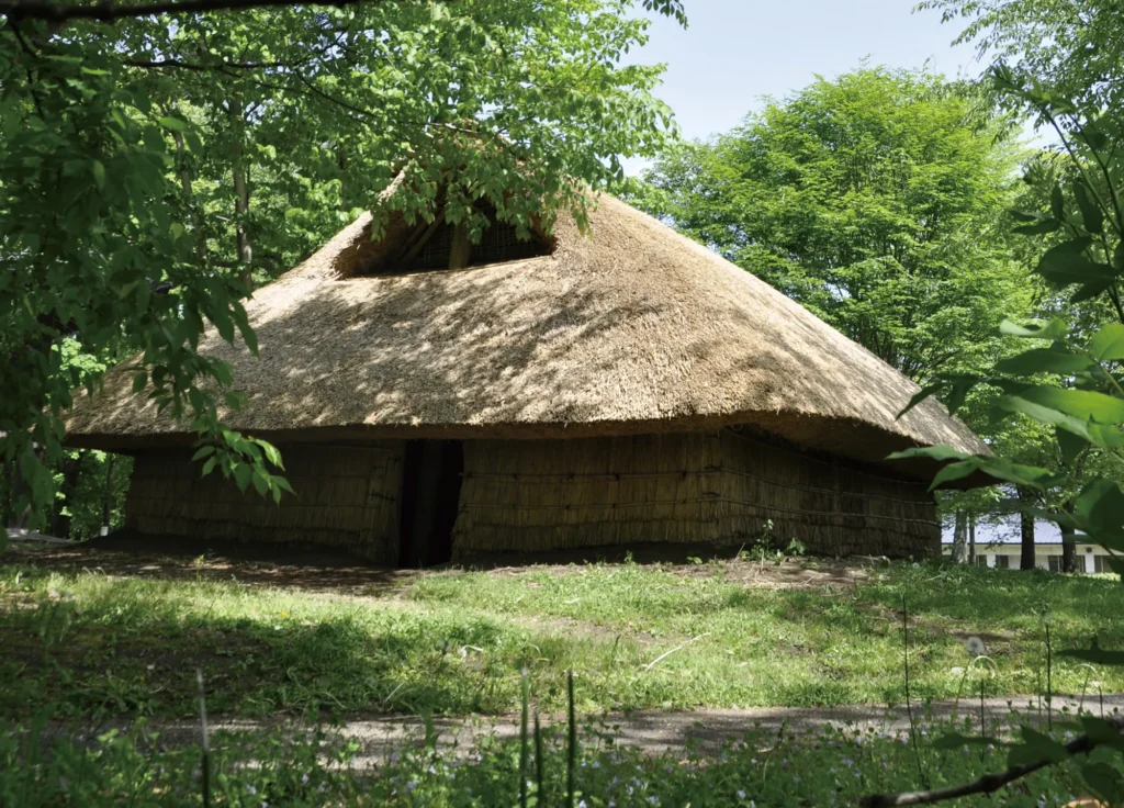 磐梯町・猪苗代町の法正尻遺跡で見つかった竪穴住居跡をもとに復元した建物です。 複式炉が再現されていて、毎週土曜日には、そこで火を焚いています。