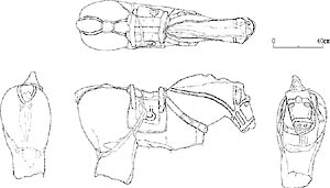 鞍の構造からみて、居木部は鞍に掛かるさまざまな加重を馬体に伝える中心部分であると捉えることができる。これに対し、鞍橋部は居木部と馬体の相対的位置を保持する上で重要であり、いわば複数の部材からなる居木部の構成を固定するための補助部分と捉えることが可能であろう。一方、鞍を馬体へ固定する方法は、乗馬用・運搬用を問わず腹帯・胸繋・尻繋で行われたと考えられる(2)。これらの固定装置の馬体における位置と居木・鞍橋部の構成