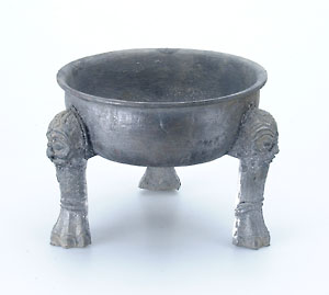 写真で解りますように、容器に3本の獣脚(獣の顔をつけた脚)が付いています。容器は、口の部分が僅かに張り出していますが、全体的に浅いボウルのような形をしています。その大きさは、直径20pほど、深さ9pほどです。獣脚は、長さ14.5p、厚さは最大で3.5pです。