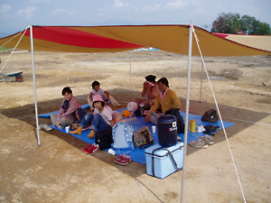 ★ ちょっと一息 当日は、残暑が厳しく、調査現場に張ってあるタープの下で一休みです。 |
