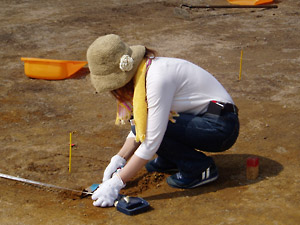 ★ 柱穴を掘る 遺構検出作業でみつかった柱の穴を少し掘り込みます。今回はご家族での参加者が多く、小さな子供も柱穴掘りに挑戦しました。昨年の縄文土器がたくさん掘り出された調査現場とは、また違った趣(おもむき)となっています。 |