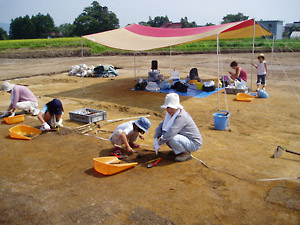 体験発掘ツアーのようす平成16年9月3日(土)に、当事業団で実施している喜多方市高堂太(たかどうた)遺跡を会場として発掘体験ツアーを実施し、21名のみなさんが参加しました。