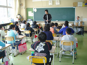★ 導入部分 1学期の社会科の最初の授業で、はじめに担任の先生から昔の人たちの暮らしについてのお話がありました。この後、まほろん職員がまほろんの概要や関本小学校周辺の遺跡、縄文時代の暮らしについて説明しました。 |
