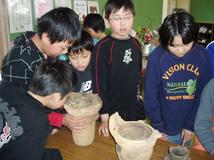 ★ 土器にさわる 今回は、縄文時代中期の土器2点、晩期の土器1点、石器6点の合計9点の本物の資料と毛皮などの復元資料を持参し、子供たちに 縄文時代の実生活で使われた道具にさわる体験をしました。 |