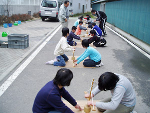 ★ 火おこし挑戦 敷地の通路で2人1組で舞いぎりによる火おこしに挑戦しました。職員の手助けもありましたが、14人全員が火をおこすことに成功しました。 |