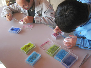 ● ガラス片を入れる 濃紺、水色、黄緑、えんじ色の4色のガラスを準備し、砕片を鋳型に入れていきます。溶ける段階ですきまが埋まるので、かなりの量を盛りつけます。 |