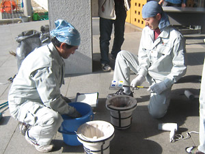 ● 鋳こみ作業 七輪で炭火をおこし、その上に鋳型を置き、蓋をかぶせてドライヤーで風を送ります。温度は900度前後まで上げてガラス片を溶かします。七輪の空気孔からはガラスの溶けるようすを観察することができます。 |