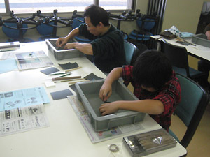 ● 鋳型づくり 今回は、耐熱石膏を彫刻刀で削り、勾玉の鋳型を作りました。彫刻刀で平滑な面を作るのはけっこう大変な作業です。 |