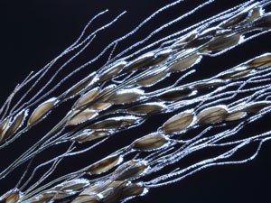 ★写真をクリックすると拡大します 11月25日(水) 今年の「古代の田んぼ」は、晩秋に至っても稲穂が頭を垂れませんでした。後ろから光を当てると、このとおりに透けて見えます。確認したところ、籾にはまったく実が入っていませんでした。 残念な結果でしたが、これにはさまざまな原因が考えられます。日当たりが悪く、水温も低かったため、稲の生育に必要な温度が得られなかったことや土壌などが原因と考えられます。 今年の経験を来年の作付につなげていきたいと思います。 11月6日(金)その2 すっかり稲刈りも終わり、寂しくなった田んぼに、夕日が訪れました。 11月6日(金)その1 慣用句に「実るほど頭を垂れる稲穂かな」というものがありますが、まほろんの稲穂はなかなか頭を垂れません。そうこうしているうちに、先日の雪。半分ほどが倒れてしまいました。 そこで急きょ、稲刈りをすることにしました。小さな「古代の田んぼ」なので、あっという間に終わりました。 →一つ前の記録へ