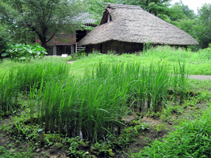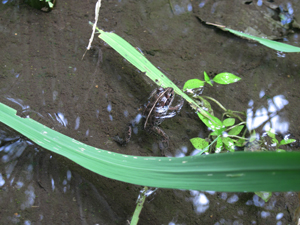 「古代の田んぼ」にはトノサマカエルがたくさん住みついています。田んぼの中を泳ぐ姿はとても気持ちよさそうです。 |