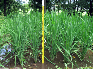 古代米は丈100センチほどになりました。日差しをいっぱい浴びて生育著しいです。 現代米(コシヒカリ)もほぼ同じ大きさです。 |