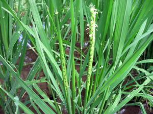 ついに古代米に出穂(しゅっすい)が確認できました。所々で開花しています。白っぽく見えるのが「おしべ」です。