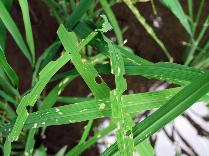 ただ心配もあります。古代米・現代米(コシヒカリ)ともに葉の食害が見られます。エサキモンキツノカメムシ(江崎紋黄角亀虫)が付いています。 |
