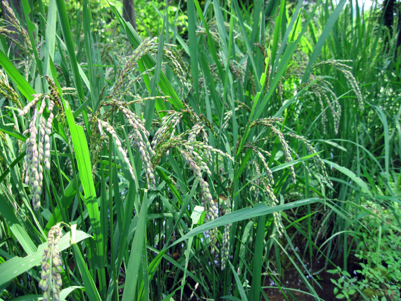 8月24日(火)その1 太陽の暖かさと、田んぼに満ちる水を十分に吸収して、稲はぐんぐん成長しています。古代米の稲穂は少しづつ垂れてきました。このまま順調にいけば、うまく収穫できそうです。