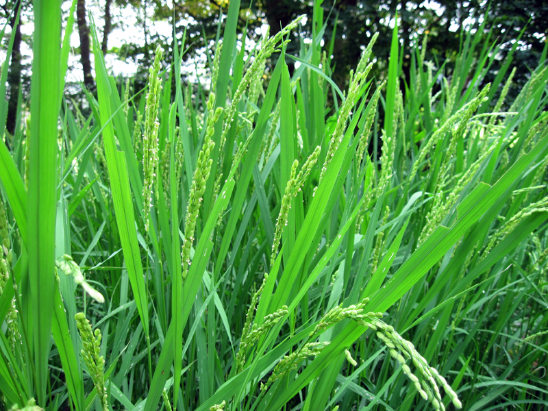 ★写真をクリックすると拡大します 8月24日(火)その4 写真は、ブチヒゲカメムシです。主に現代米(コシヒカリ)に多く発生しています。 8月24日(火)その3 この時期になると数多くの害虫が見られます。 写真は、イネツトムシと呼ばれる蛾の幼虫です。成虫はイチモンジセセリと呼ばれます。 イネの葉を数枚つづり合わせて「つと」(苞)様の巣を作り、昼間はこの中にひそみ、夜出て葉をむさぼり食べます。 8月24日(火)その2 現代米(コシヒカリ)もほとんど出穂しましたが、まだ垂れてません。これからの成長具合に期待です。 8月24日(火)その1 太陽の暖かさと、田んぼに満ちる水を十分に吸収して、稲はぐんぐん成長しています。古代米の稲穂は少しづつ垂れてきました。このまま順調にいけば、うまく収穫できそうです。 →一つ前の記録へ