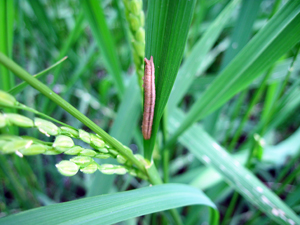 8月24日(火)その3 この時期になると数多くの害虫が見られます。 写真は、イネツトムシと呼ばれる蛾の幼虫です。成虫はイチモンジセセリと呼ばれます。 イネの葉を数枚つづり合わせて「つと」(苞)様の巣を作り、昼間はこの中にひそみ、夜出て葉をむさぼり食べます。