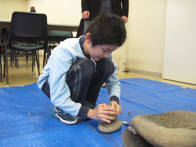 磨石(すりいし)・凹石(くぼみいし)をつかって、クルミの堅い殻を割ります。うまく狙うと、きれいに割れます。