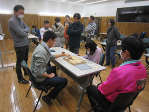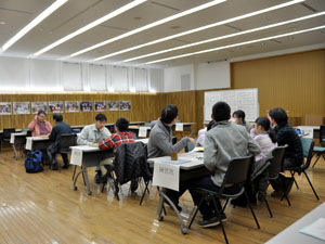 2.練習風景 ルールの説明のあと、本番に備えて、各ブースで練習する風景が見られました。皆さん、対戦することとなる相手の出方を見ながら、それぞれに作戦を練っています。 |