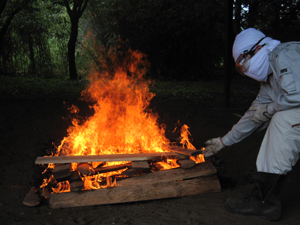 5.野焼き@ 作品を火元の周りに並べ、午前中かけて土器の向きを時々変えながら、万遍なく「あぶり」を行いました。 土器の表面が黒くなってきたら、全体を薪で覆って一気に焼き上げる「本焼き」を行いました。 |