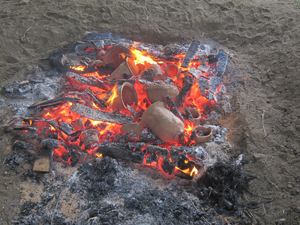 6.野焼きA 「本焼き」して、約30分ほどで、材が燃え落ち、焼きあがった土器が姿を現しました。 今年度は、乾燥期間を十分にとったこと、粘土量が少ないため乾燥が早かったことなどから、参加者の作品は割れることなく焼き上がりました。 出来上がった作品は、無事に参加者全員にお渡ししました。満足のいく作品ができたでしょうか? |