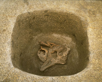 (3)近世のお墓 小野町の本飯豊遺跡からは、近世のお墓が46基みつかっています。墓穴の形は方形・長方形・円形などで、木棺内に遺体が屈んだ形で残っているものもありました。 副葬品としては、キセル・寛永通宝・陶器などの他に陶器の人形、数珠などもありました。寛永通宝や陶器などからこの墓地は江戸時代の18世紀後半〜19世紀前半頃に、一族か家単位で埋葬に使用された墓地であると思われます。 近世墓 お墓からみつかった陶器碗